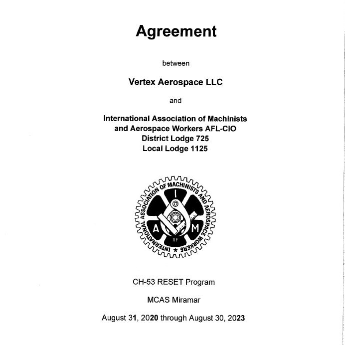 The IAM recently negotiated a collective bargaining agreement with Vertex Aerospace with respect to work performed on the CH-53 RESET program at the Marine Corps Air Station Miramar, San Diego, California. Check out the contract to learn more about what these IAM members were able to negotiate.